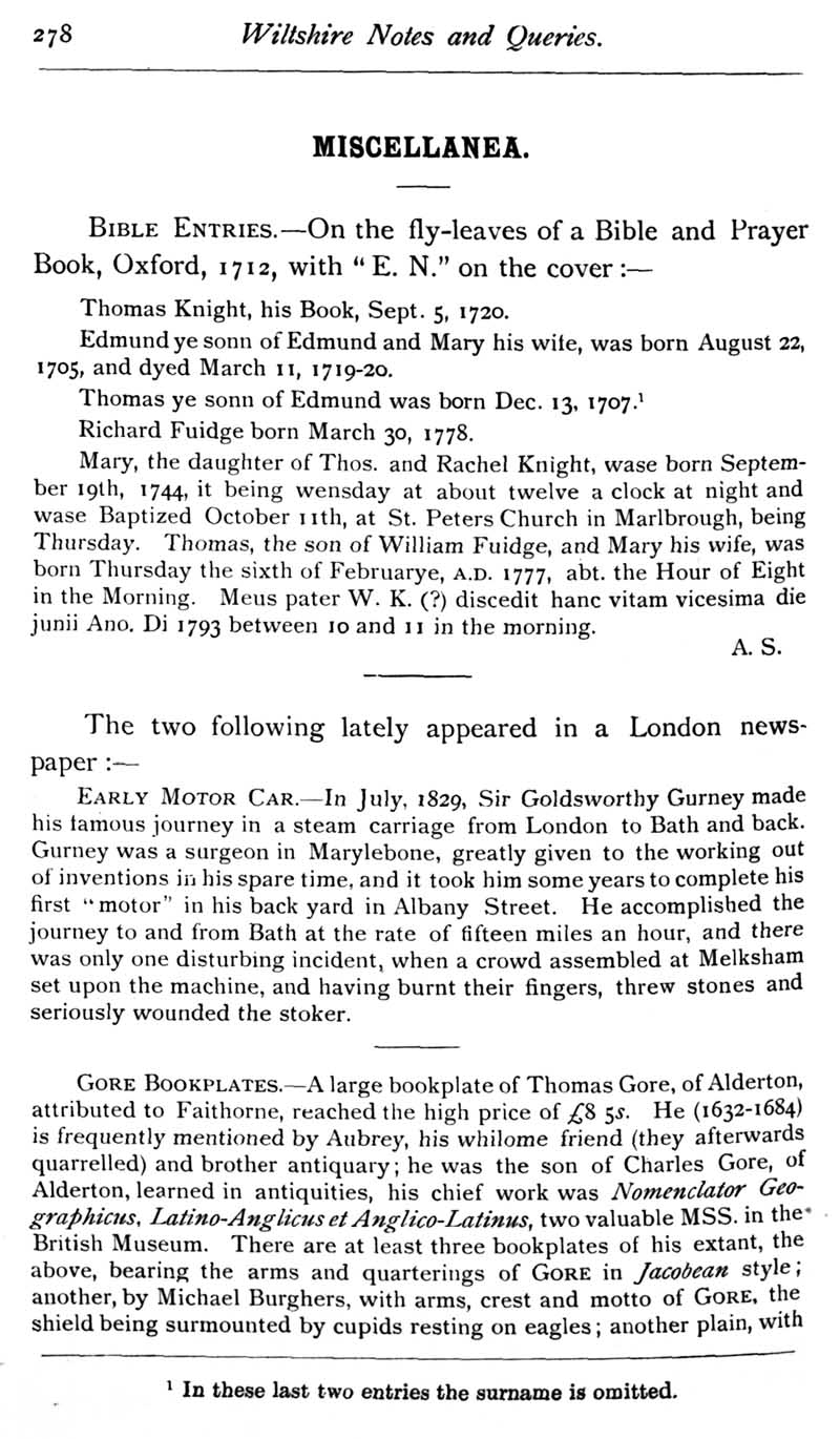 Chapter 7 Place House Melksham; Records of Wiltshire Parishes; Quakerism in Wiltshire; Feet of Fines for Wiltshire; Purton; Melksham 'City'; Arms in Westwood Church; Adam Goldney to george Fox; Wiltshire Briefs; Miscellanea; Queries; Replies; Notes on Books.
