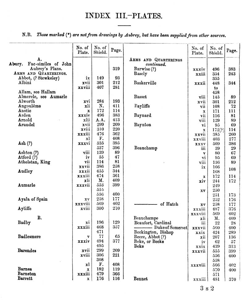 Page 1 Index, Abury (Avebury); (Family Arms and Quarters) from Abbot to Bennet.