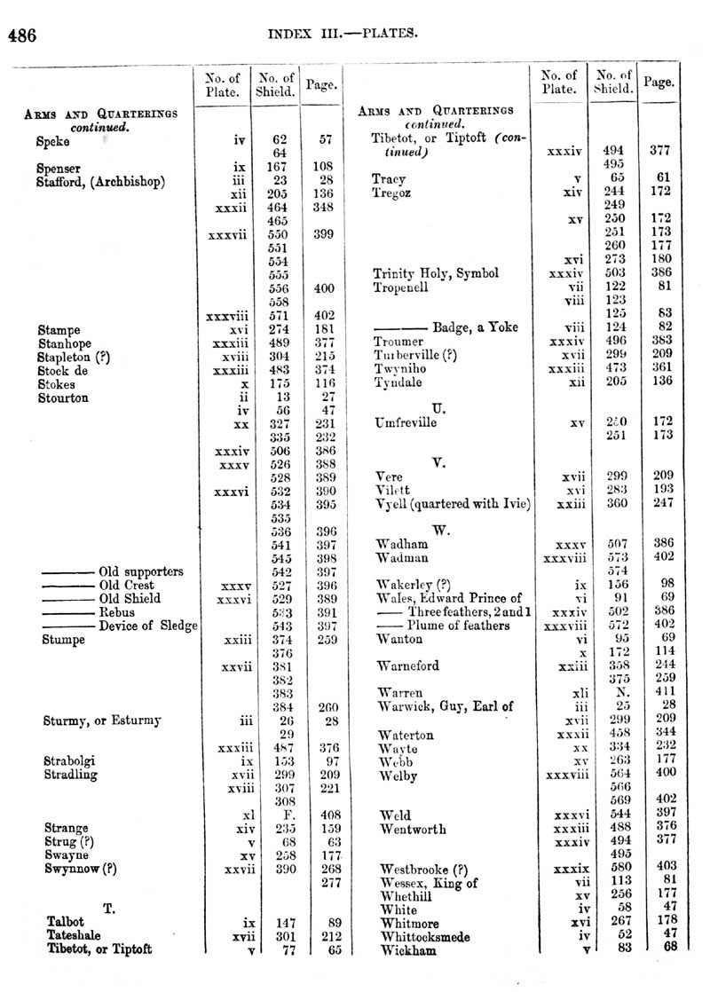 Page 8 Index (Family Arms and Quarters), Speke to Wickham.