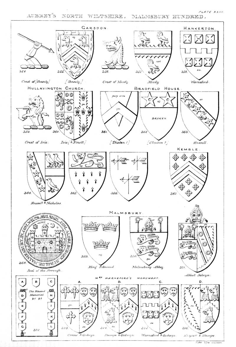 Page 23 Coats of arms in Garsdon, Hankerton, Kemble and Malmesbury churches and Bradfield House.