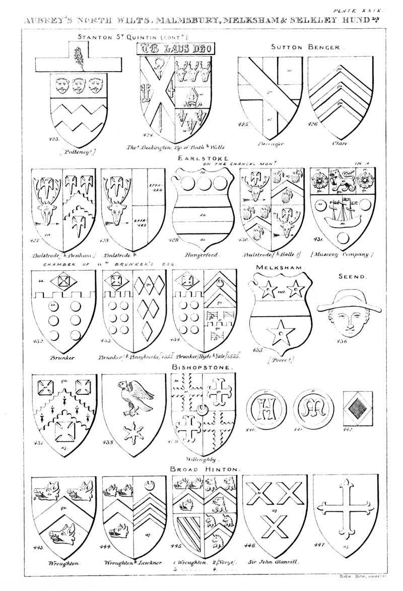 Page 29 Coats of Arms in Stanton St. Quintin, Sutton Benger, Erlestoke, Melksham, Seend, Bishopstone (north Wiltshire) and Broad Hinton churches.
