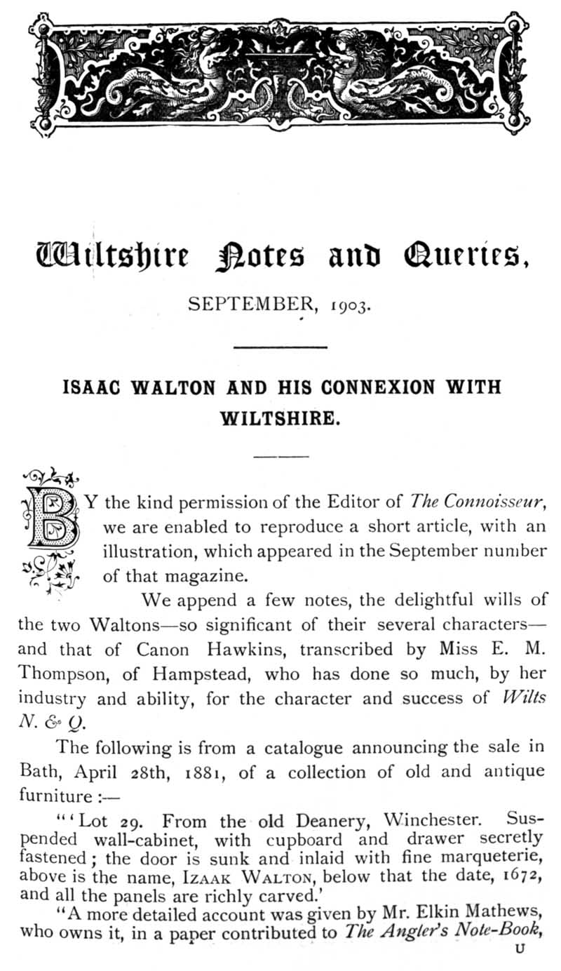 Chapter 8 Isaac Walton, Records of Wiltshire Parishes; Quakerism in Wiltshire; Feet of Fines for Wiltshire; Thomas Bundy's Will; Window and Light 1774-1775; Dugdale of Seend; Queries; Replies; Cartularies of Wiltshire Abbeys etc; Wiltshire Briefs; Notes on Books