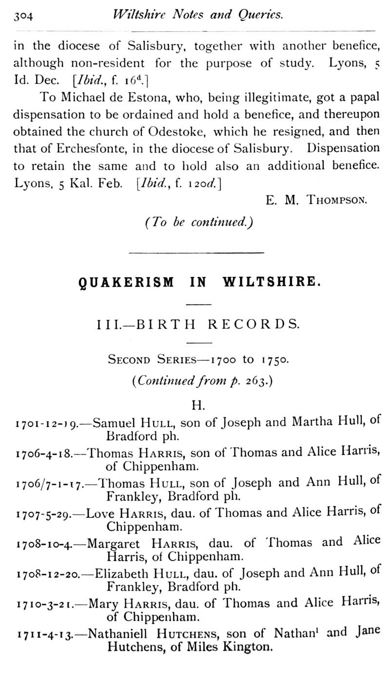 Chapter 8 Isaac Walton, Records of Wiltshire Parishes; Quakerism in Wiltshire; Feet of Fines for Wiltshire; Thomas Bundy's Will; Window and Light 1774-1775; Dugdale of Seend; Queries; Replies; Cartularies of Wiltshire Abbeys etc; Wiltshire Briefs; Notes on Books