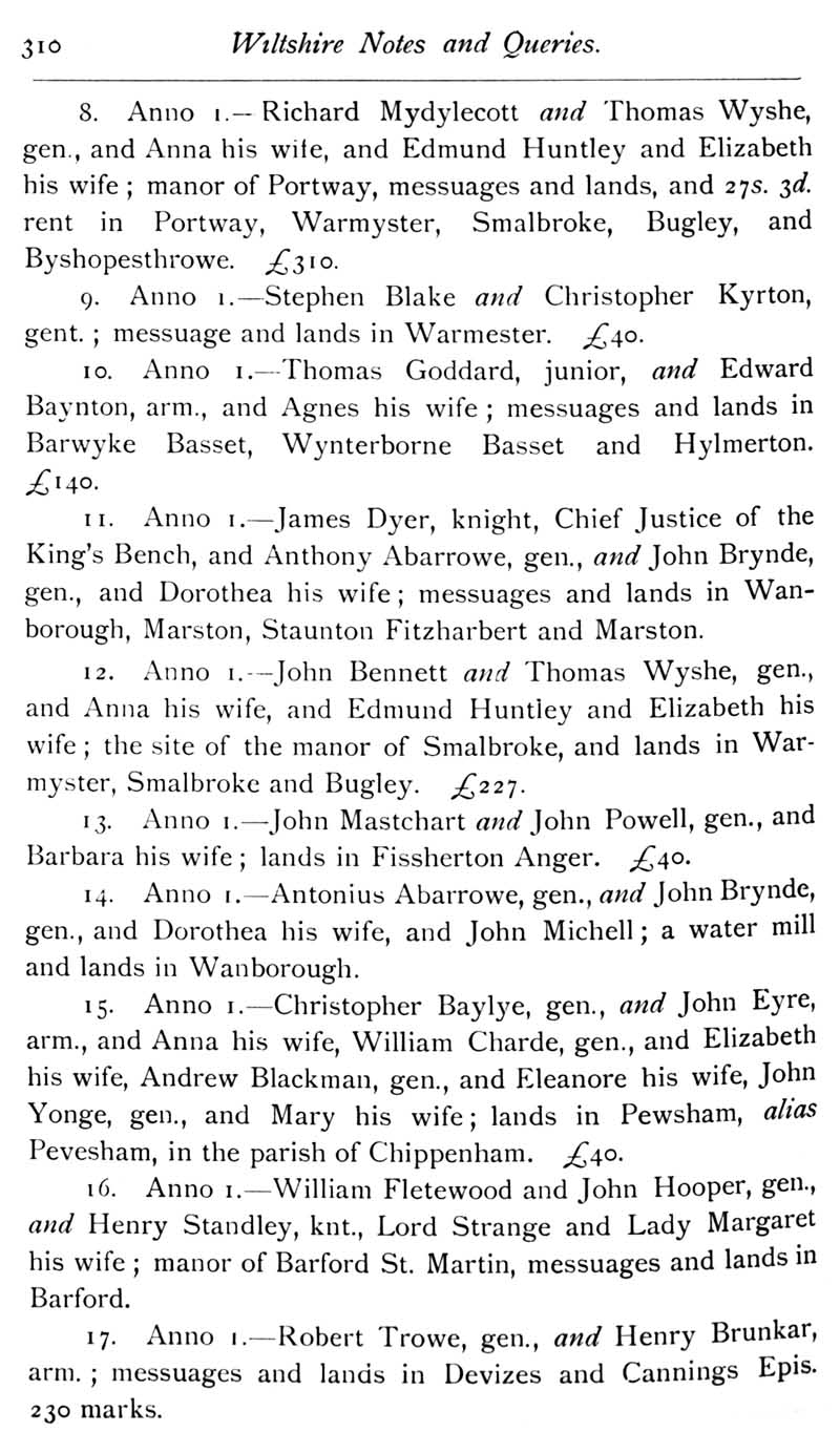 Chapter 8 Isaac Walton, Records of Wiltshire Parishes; Quakerism in Wiltshire; Feet of Fines for Wiltshire; Thomas Bundy's Will; Window and Light 1774-1775; Dugdale of Seend; Queries; Replies; Cartularies of Wiltshire Abbeys etc; Wiltshire Briefs; Notes on Books