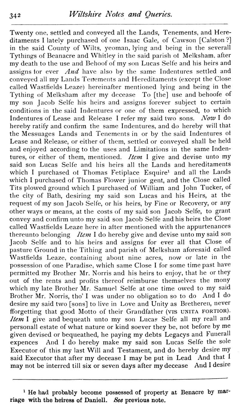 Chapter 9 Old Manor, Beanacre; Place House, Melksham; Thomas Selfe of Cadley, Melksham; Records of Wiltshire Parishes; John Noyes of Calne; Quakerism in Wiltshire; Feet of Fines for Wiltshire; Queries; Replies; Notes on Books
