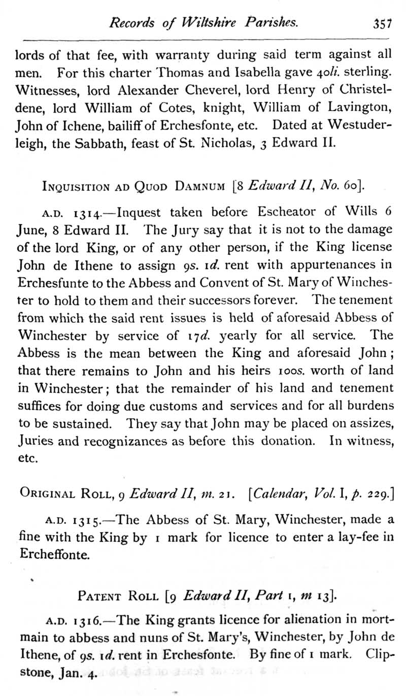 Chapter 9 Old Manor, Beanacre; Place House, Melksham; Thomas Selfe of Cadley, Melksham; Records of Wiltshire Parishes; John Noyes of Calne; Quakerism in Wiltshire; Feet of Fines for Wiltshire; Queries; Replies; Notes on Books