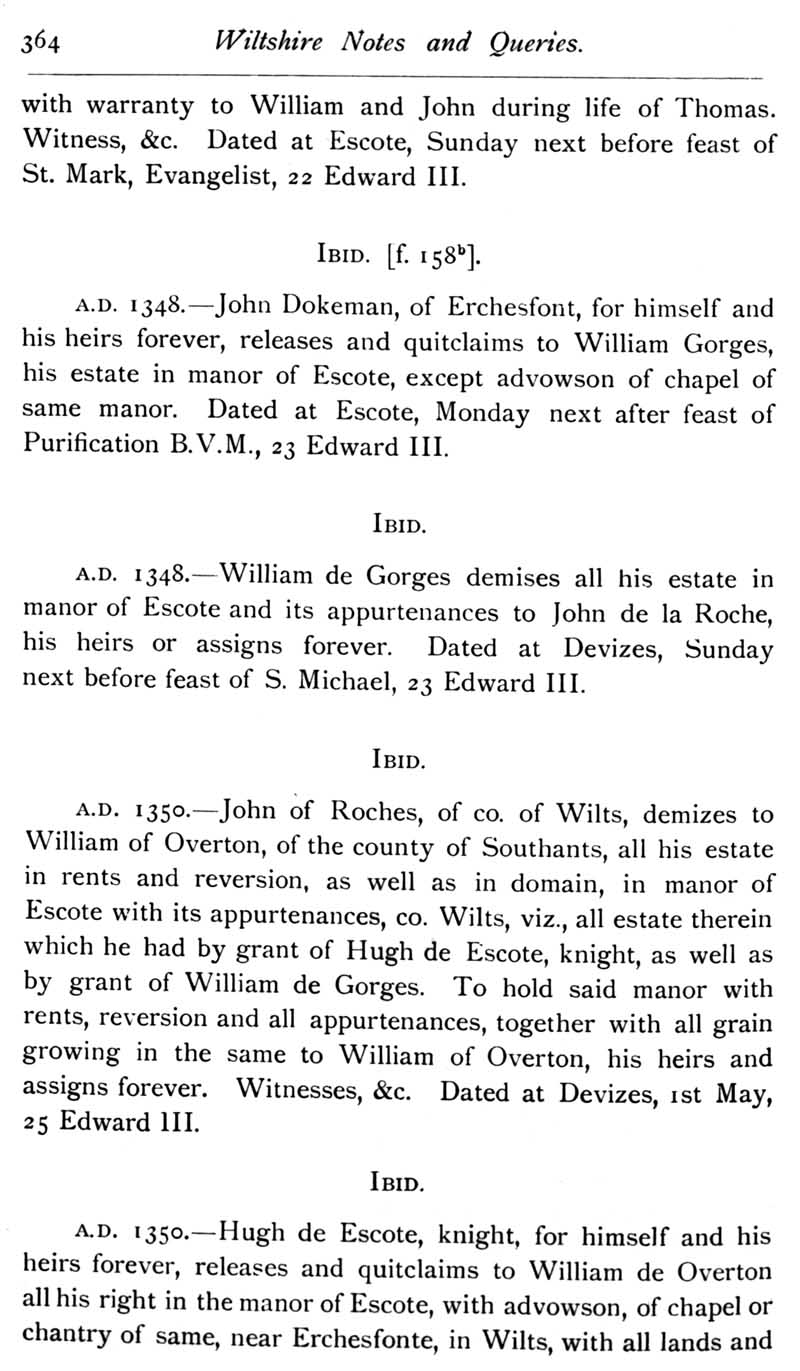 Chapter 9 Old Manor, Beanacre; Place House, Melksham; Thomas Selfe of Cadley, Melksham; Records of Wiltshire Parishes; John Noyes of Calne; Quakerism in Wiltshire; Feet of Fines for Wiltshire; Queries; Replies; Notes on Books