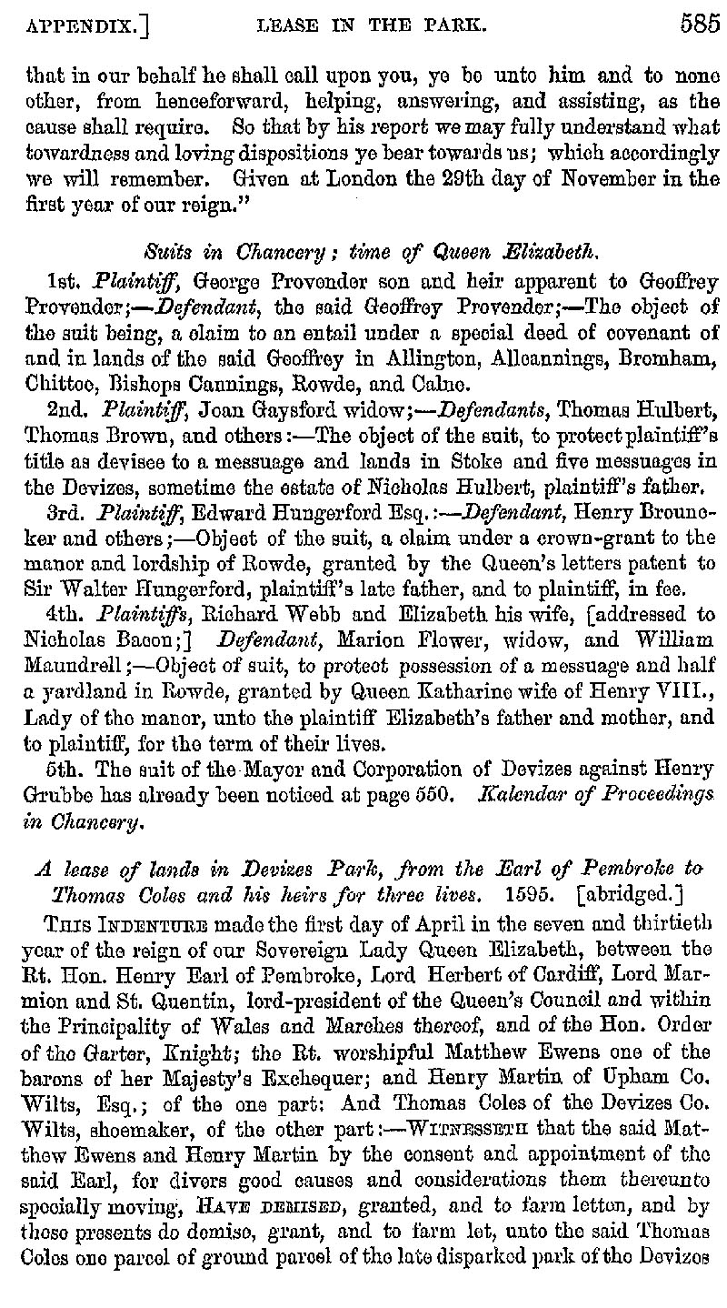 Page 23 Appendix; Suits in Chancery during Elizabeth's Reign; Lease of lands in Devizes Park to Thomas Coles. 1595