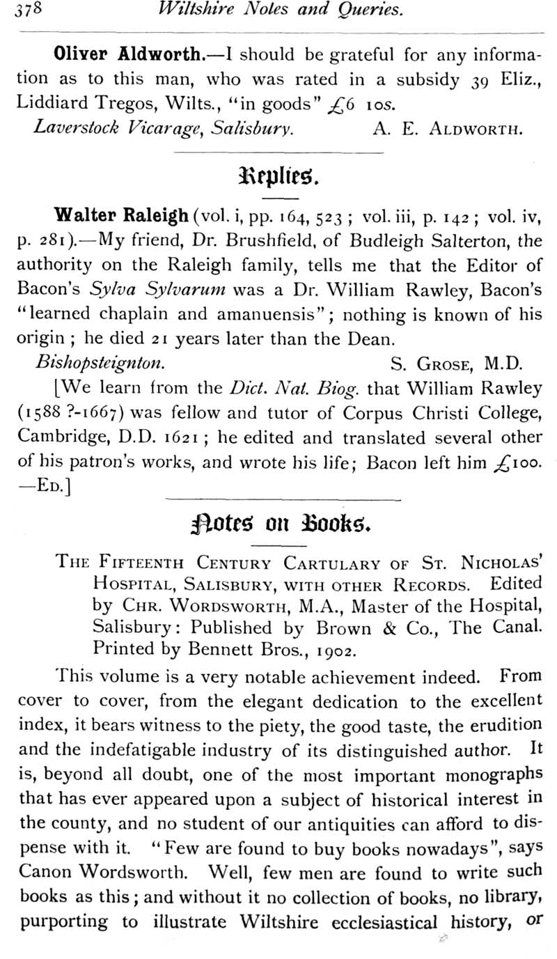Chapter 9 Old Manor, Beanacre; Place House, Melksham; Thomas Selfe of Cadley, Melksham; Records of Wiltshire Parishes; John Noyes of Calne; Quakerism in Wiltshire; Feet of Fines for Wiltshire; Queries; Replies; Notes on Books