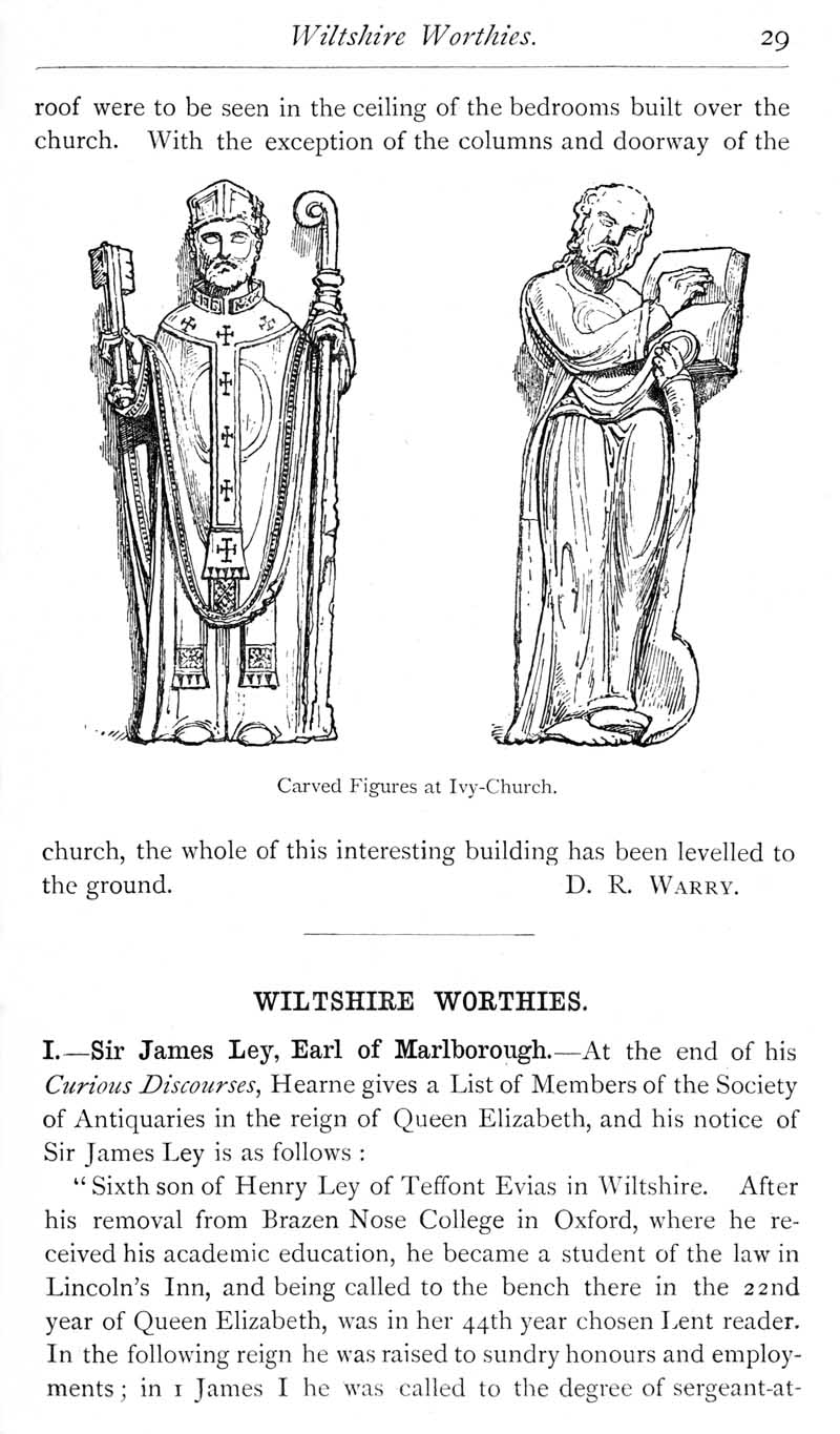 Page 28 Account of Ivychurch Priory in parish of Alderbury; Drawings of carved figures at Ivychurch. Sir James Ley, Earl of Marlborough.