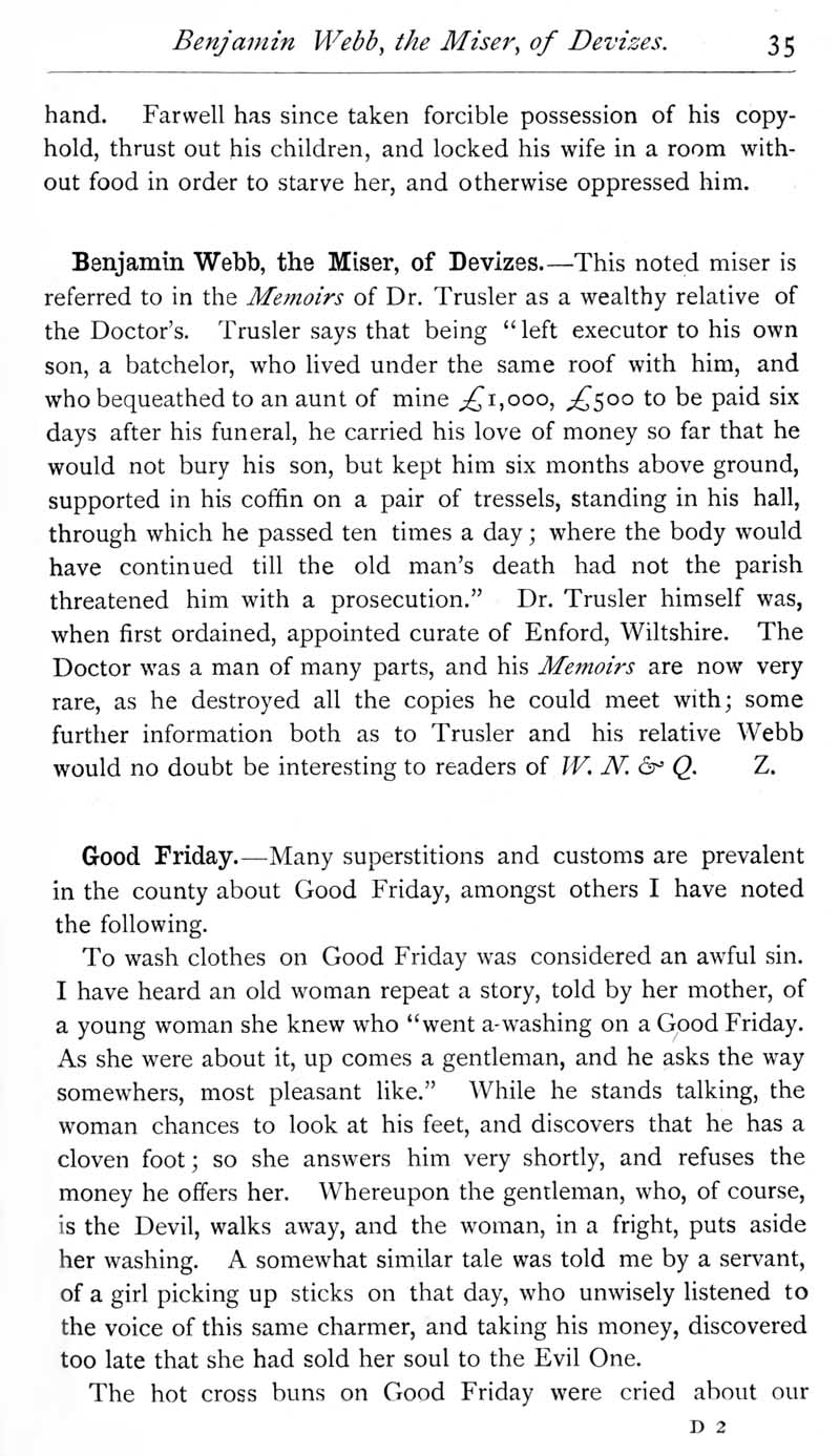 Page 34 Petition of Osmund Gibbs to House of Lords against deprivation of his land at Westwood, 1640. Benjamin Webb the miser of Devizes, mentioned in memoirs of Dr Trusler.Good Friday superstitions.