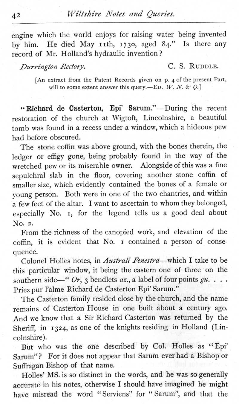 Page 41 Rev. Thomas Holland of Amesbury, inventor of an engine for raising water. \"Richard de Casterton, Bishop of Sarum\".