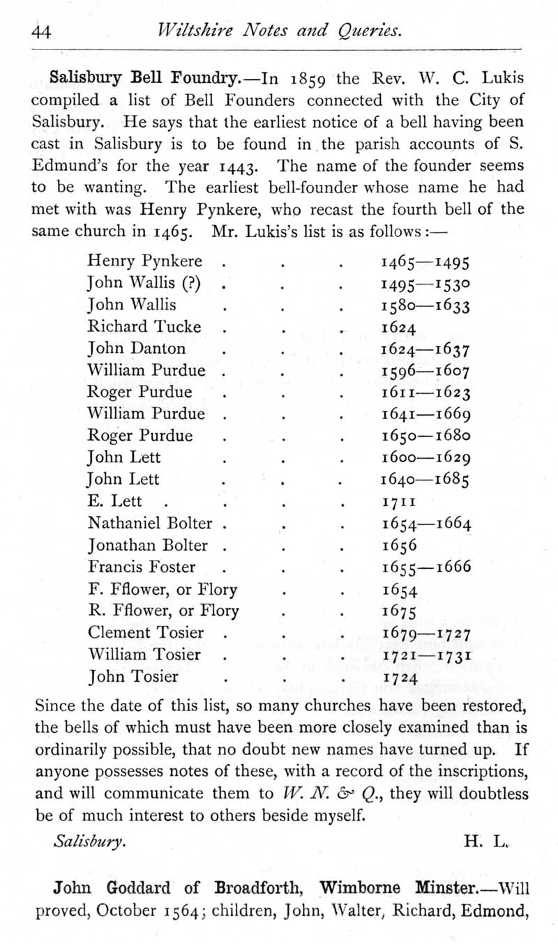 Page 43 List of Salisbury bell founders, 1465-1724. Query about John Goddard of Broadforth, Wimborne Minster, whose will was proved 1564.