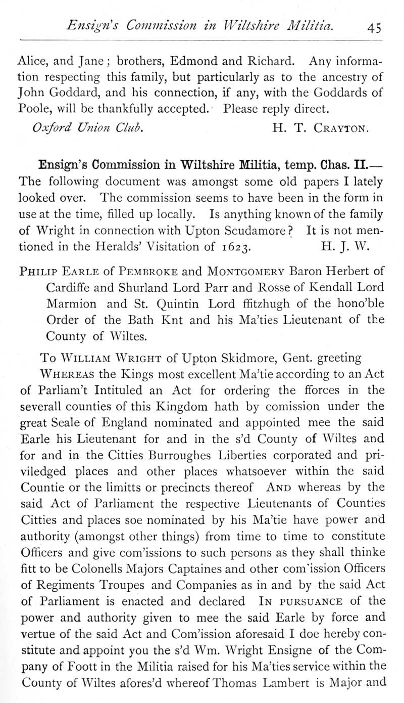 Page 44 Query about John Goddard of Broadforth, Wimborne Minster, whose will was proved 1564. Commission of William Wright of Upton Scudamore as an ensign in the Wiltshire Militia, 1680.