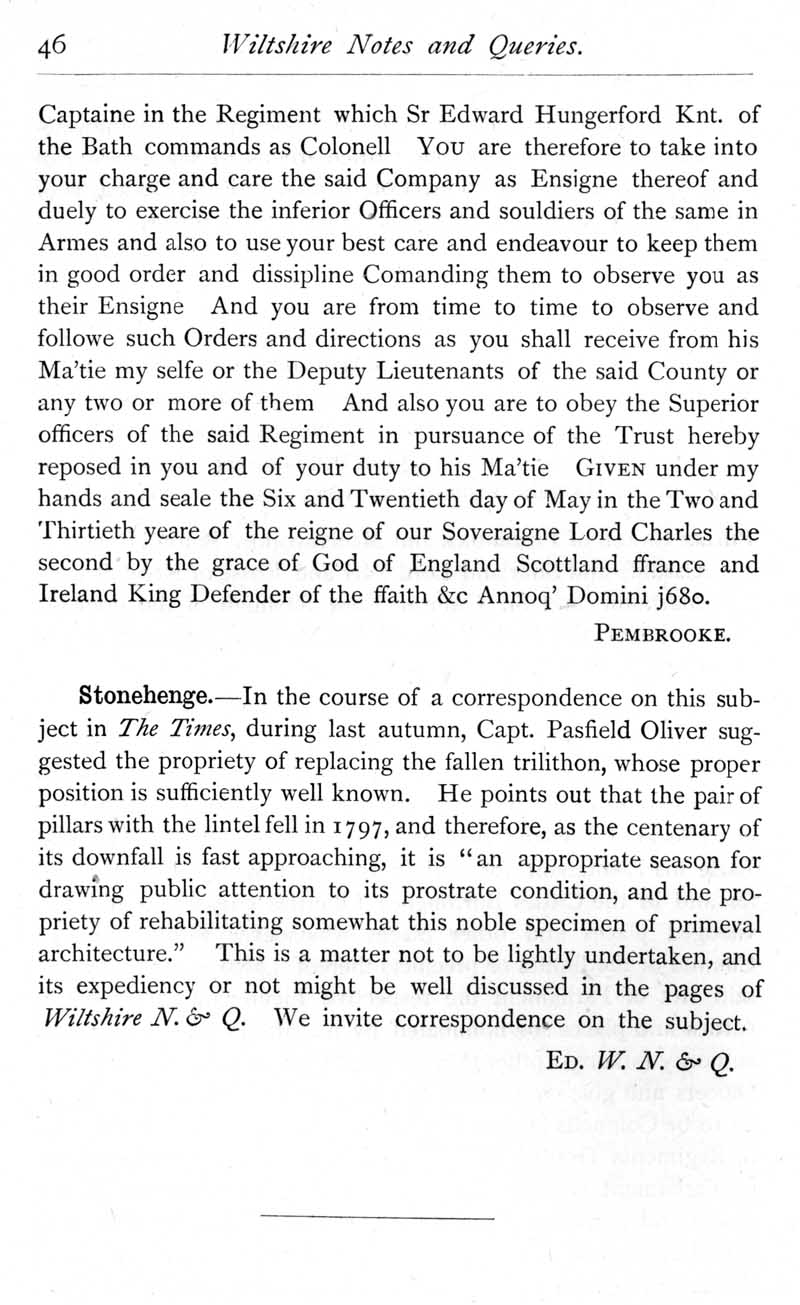 Page 45 Commission of William Wright of Upton Scudamore as an ensign in the Wiltshire Militia, 1680. The fallen trilithon at Stonehenge.