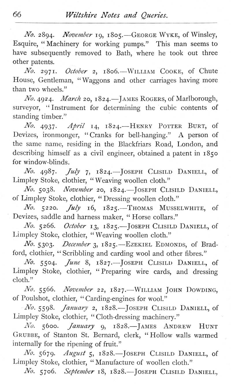 Page 19 A list of Wiltshire patentees: George Wyke of Winsley, William Cooke of Chute, James Rogers of Marlborough, Henry Potter Burt of Devizes, Joseph Clisild Daniell of Limpley Stoke, Thomas Musselwhite of Devizes, Ezekiel Edmonds of Bradford, William John Dow