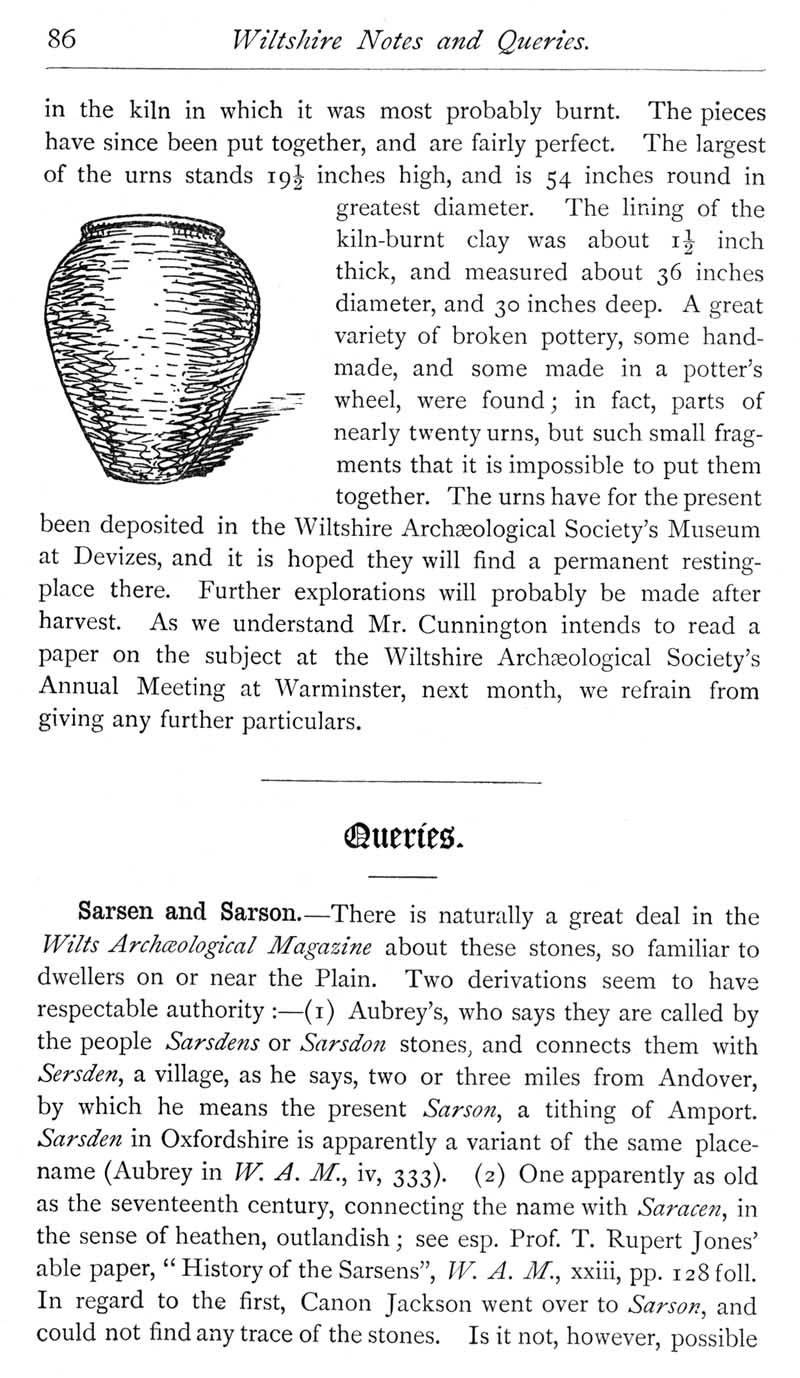 Page 39 Archaeological discovery at Pewsey of Romano-British urns. Derivation of the word 'sarsen'.