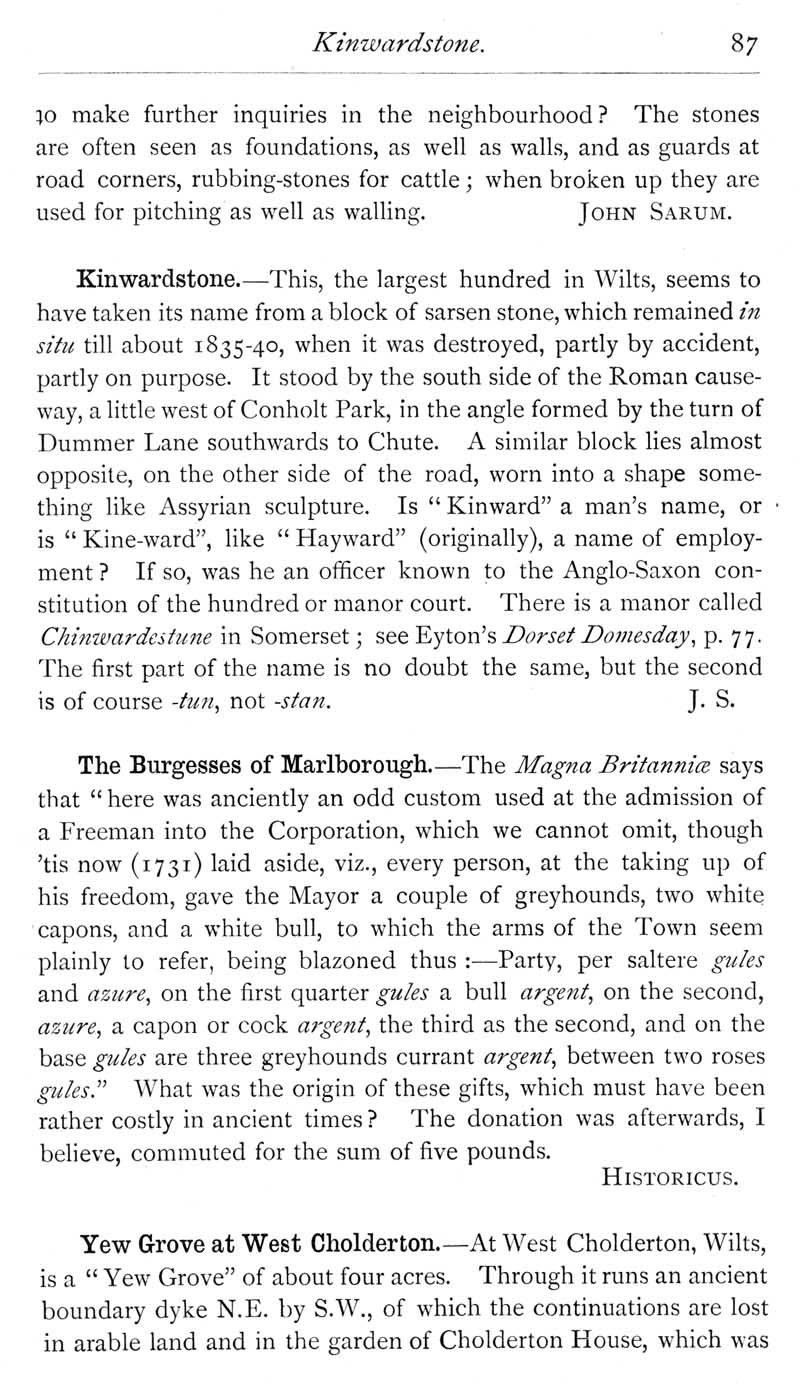 Page 40 Derivation of the word 'sarsen'. Derivation of 'Kinwardstone'. Old custom used at the admission of a Freeman into the Corporation of Marlborough. Yew Grove at West Cholderton.
