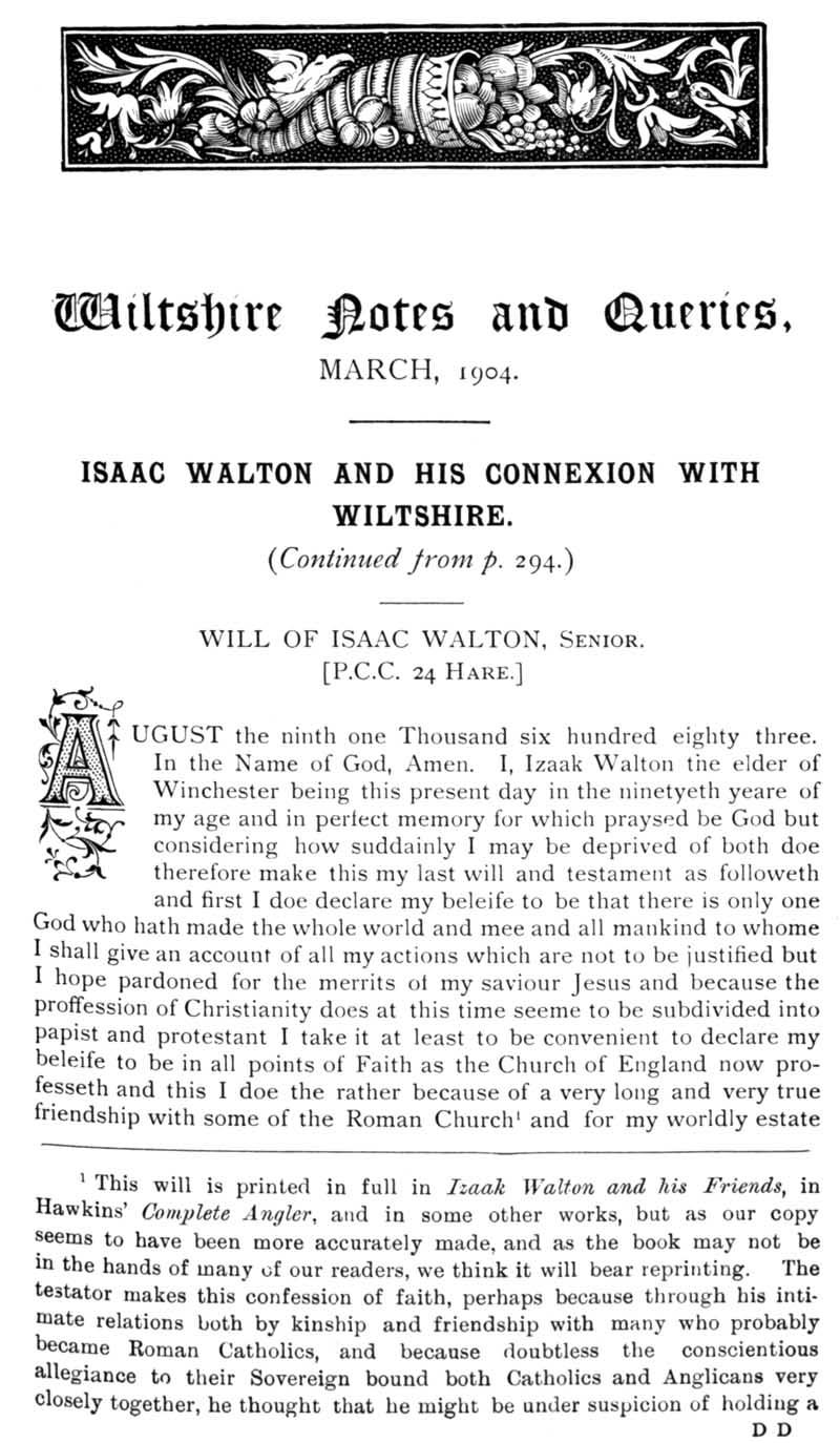 Chapter 10 Isaac Walton; Records of Wiltshire Parishes; Feet of Fines for Wiltshire; Quakerism in Wiltshire; Corr of Aldbourne; De Chyrebury of Seend; Houlton-Selfe; The Form 'Sarum'; John Noyes of Calne; Queries; Replies; Notes on Books
