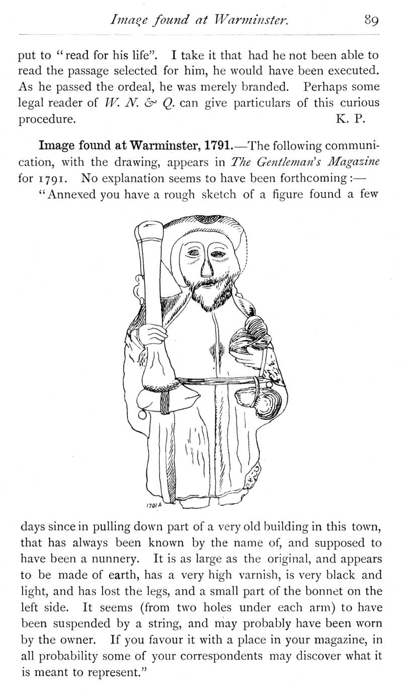 Page 42 \"Reading for life\" as a form of trial. Description and drawing of a figure found in 1791 at a supposed former nunnery in Warminster.