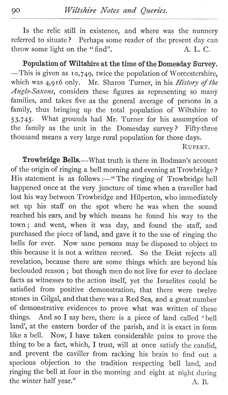 Page 43 Description of a figure found in 1791 at a supposed former nunnery in Warminster. Population of Wiltshire at the time of the Domesday survey. Trowbridge bells and the piece of land called 'bell land' in the parish.