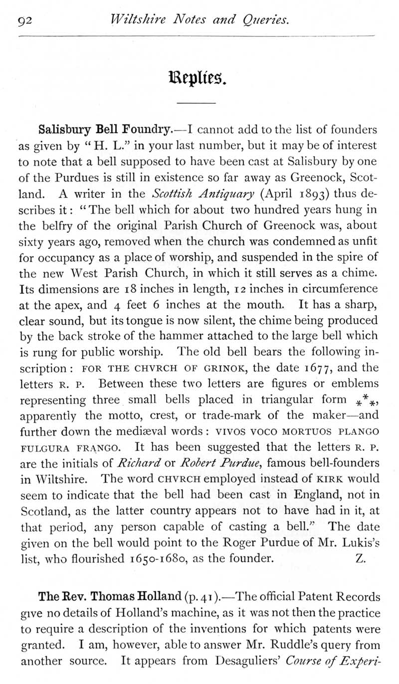 Page 45 Salisbury bell founders: possible Purdue bell at Greenock. Rev. Thomas Holland and his engine for raising water.