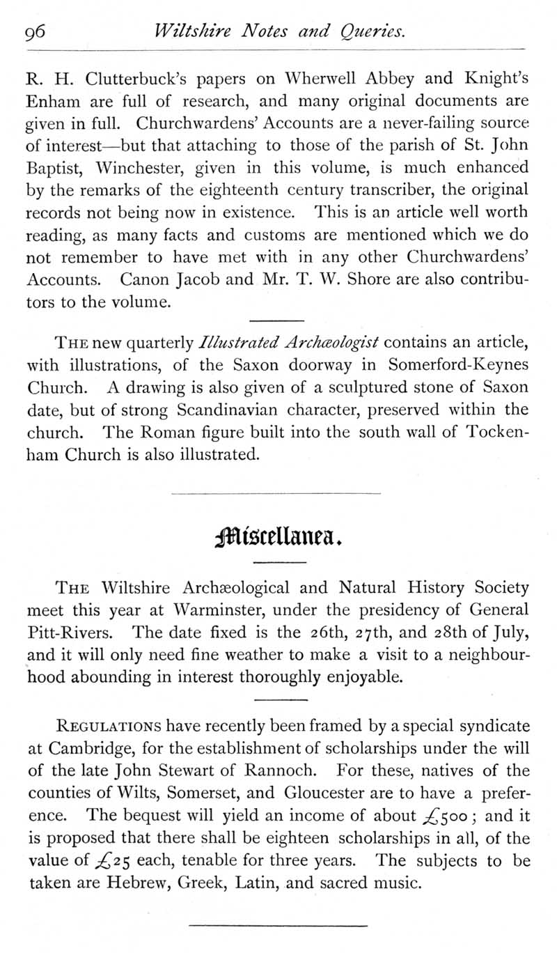 Page 49 'Hampshire Notes and Queries', Vol. 6. 'Illustrated Archaeologist' includes references to Tockenham and Somerford Keynes churches. Establishment of the Stewart scholarships at Cambridge for natives of Wiltshire, Somerset and Gloucester.