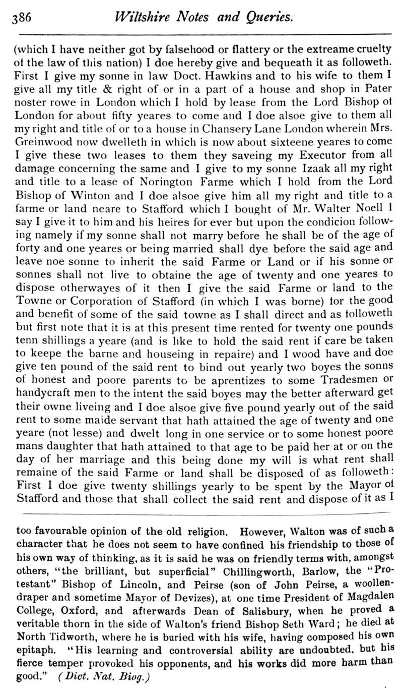 Chapter 10 Isaac Walton; Records of Wiltshire Parishes; Feet of Fines for Wiltshire; Quakerism in Wiltshire; Corr of Aldbourne; De Chyrebury of Seend; Houlton-Selfe; The Form 'Sarum'; John Noyes of Calne; Queries; Replies; Notes on Books