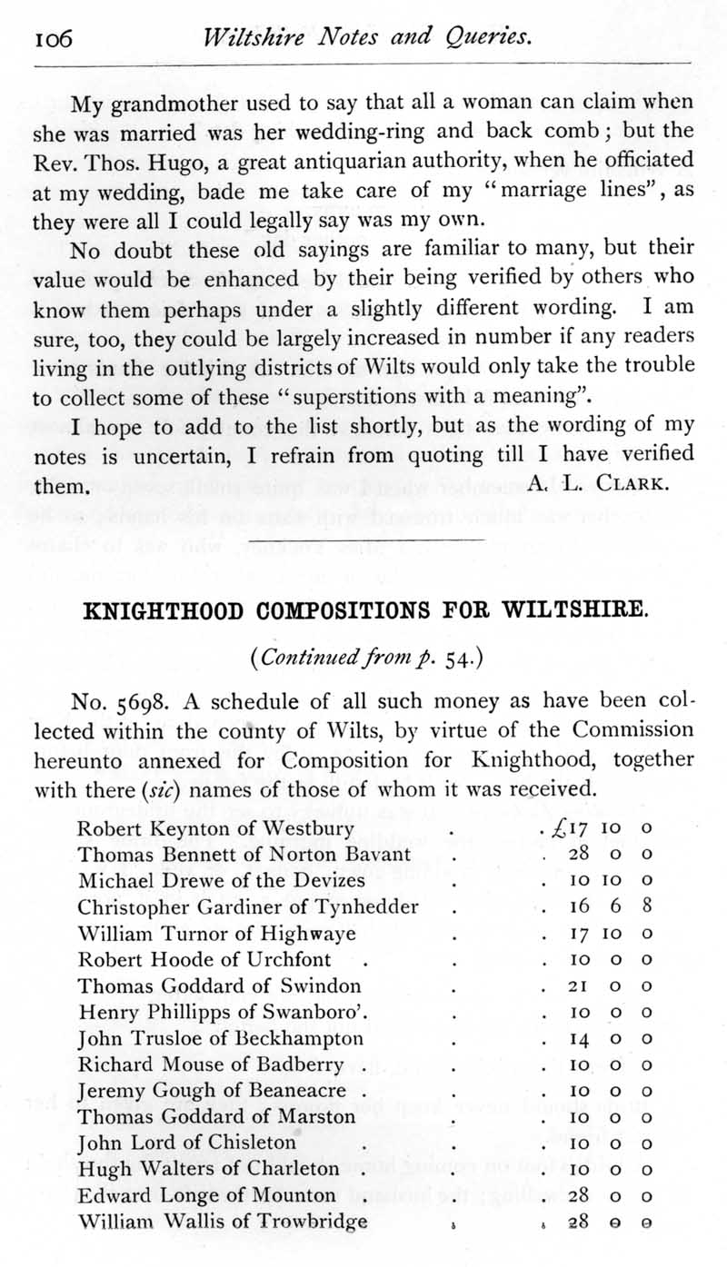 Page 11 Some information on Wiltshire folklore. Compositions for knighthood in Wiltshire, one of Charles 1's fiscal expedients in the 1630s.