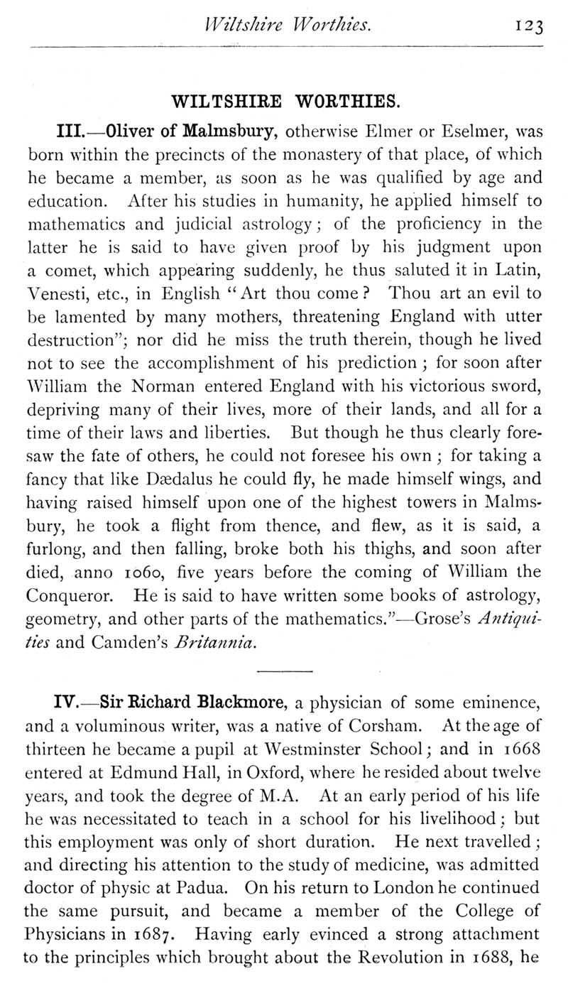 Page 28 Elmer or Oliver of Malmesbury, the monk who tried to fly (died 1060). Sir Richard Blackmore, a physician and native of Corsham.