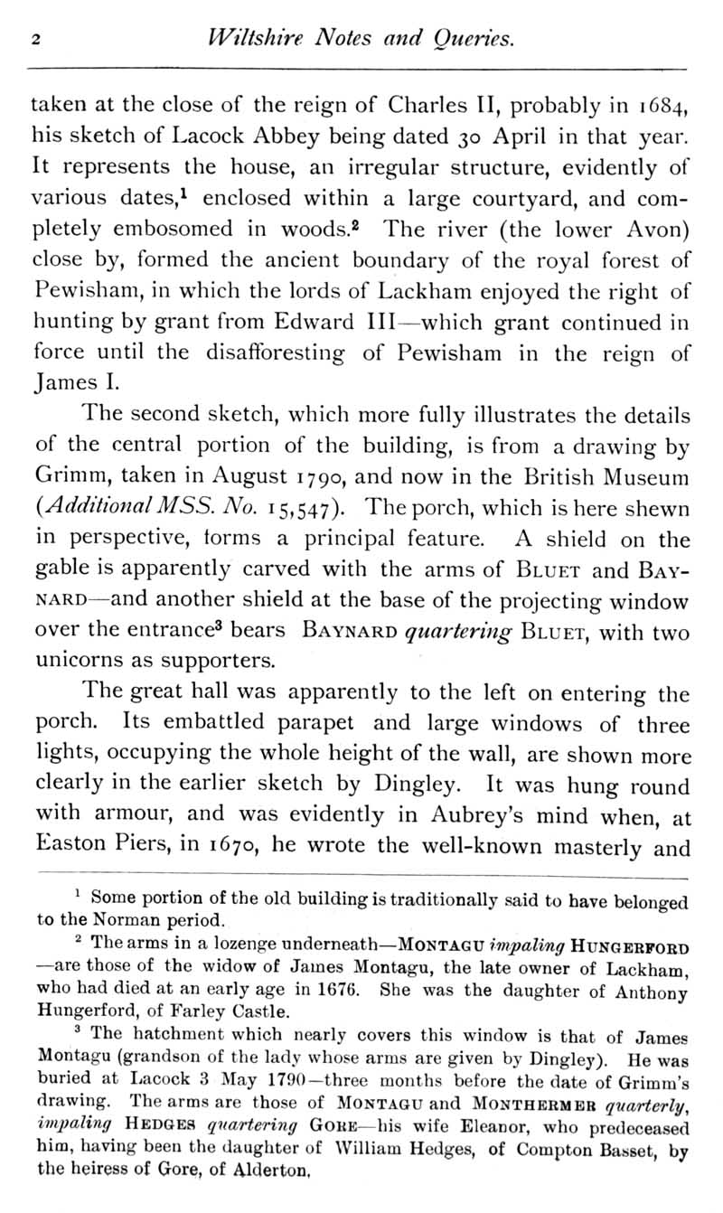 Chapter 2 Old Lackham House and its owners; Records of Wiltshire Parishes: - Bratton; Quakerism in Wiltshire; A Calendar of Feet of Fines for Wiltshire; Notes on Great Somerford; The Ancestry of the Families of Batt and Byley of Salisbury Massachusetts