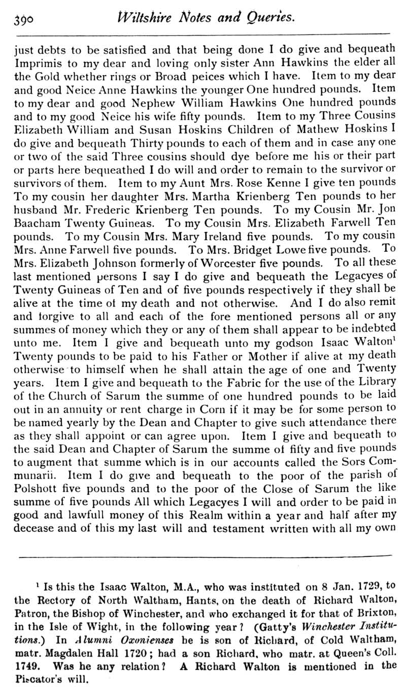 Chapter 10 Isaac Walton; Records of Wiltshire Parishes; Feet of Fines for Wiltshire; Quakerism in Wiltshire; Corr of Aldbourne; De Chyrebury of Seend; Houlton-Selfe; The Form 'Sarum'; John Noyes of Calne; Queries; Replies; Notes on Books