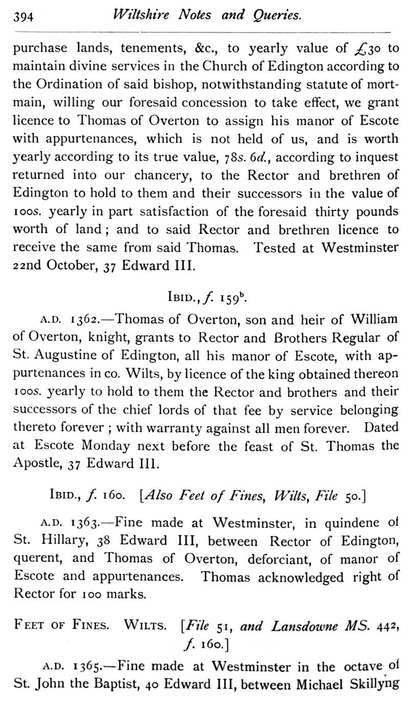 Chapter 10 Isaac Walton; Records of Wiltshire Parishes; Feet of Fines for Wiltshire; Quakerism in Wiltshire; Corr of Aldbourne; De Chyrebury of Seend; Houlton-Selfe; The Form 'Sarum'; John Noyes of Calne; Queries; Replies; Notes on Books