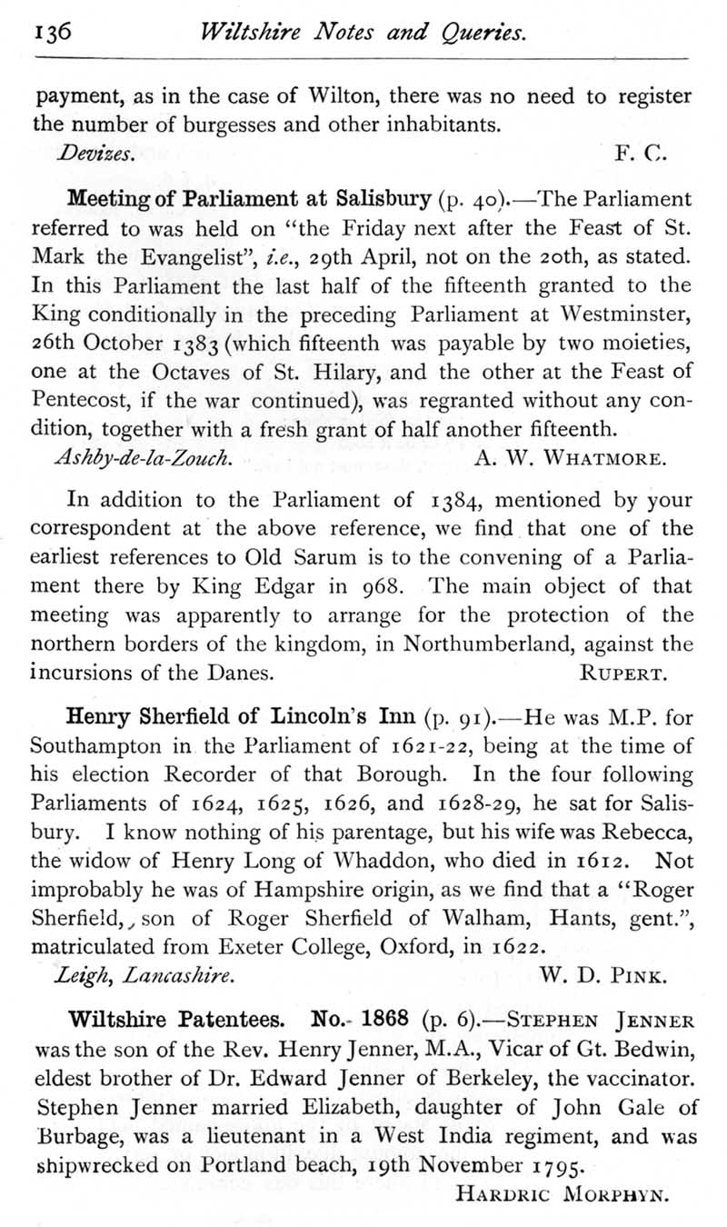 Page 41 The Domesday population of Wiltshire.Meetings of Parliament at Salisbury in 968 and 1384.Henry Sherfield of Salisbury.Stephen Jenner, son of 18th century vicar of Great Bedwyn.