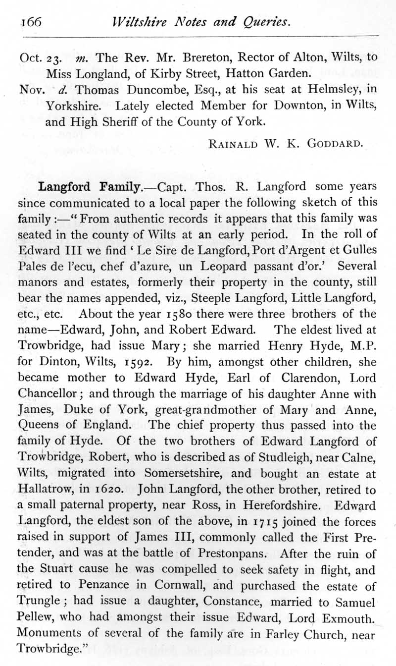 Page 21 Wiltshire births, marriages and deaths, extracted from The Town and County Magazine for 1779. The Langford family.