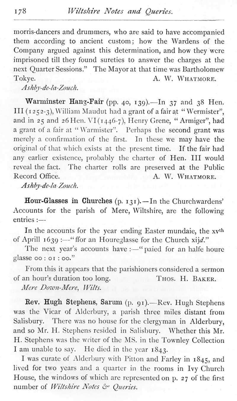 Page 33 Hob-Nob and the Giant in procession at Salisbury. Warminster Hang-Fair. Hour-glass in Mere church. Hugh Stephens, 19th century vicar of Alderbury.