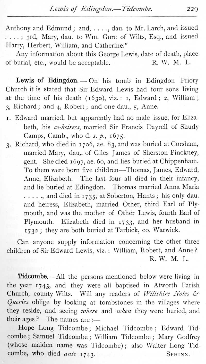 Page 40 George Lewis, who married Mary Gore of Alderton. Lewis family of Edington. Tidcombe family of Atworth.