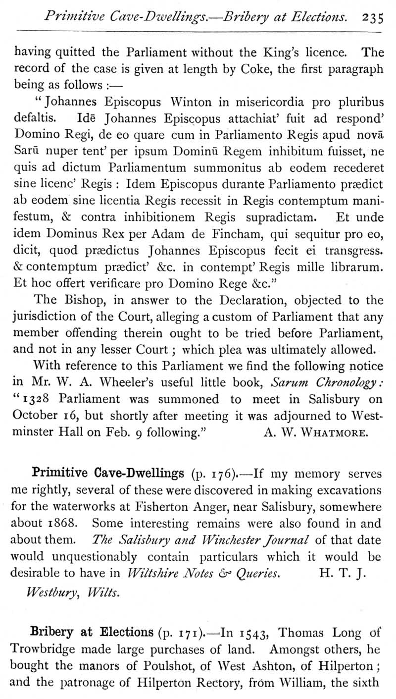 Page 46 Parliament summoned to meet in Salisbury in 1328. Primitive cave-dwellings at Fisherton Anger. Long family and bribery at elections.