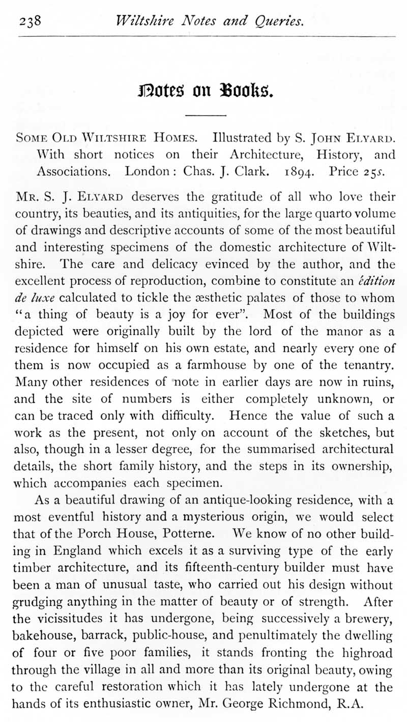 Page 49 Review of book by S.J. Elyard, 'Some Old Wiltshire Homes', which includes mention of Porch House, Potterne.