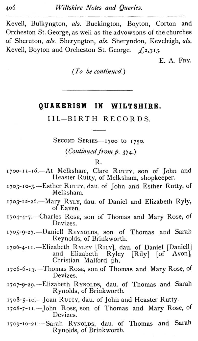Chapter 10 Isaac Walton; Records of Wiltshire Parishes; Feet of Fines for Wiltshire; Quakerism in Wiltshire; Corr of Aldbourne; De Chyrebury of Seend; Houlton-Selfe; The Form 'Sarum'; John Noyes of Calne; Queries; Replies; Notes on Books