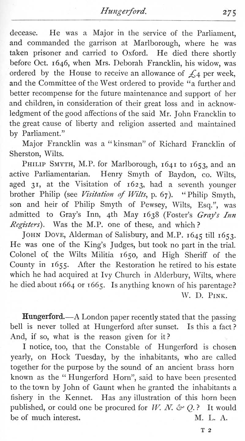 Page 37 Wiltshire members of the Long Parliament: John Francklin, Marlborough; Philip Smyth, Marlborough; John Dove, Salisbury. Hungerford: the passing bell, and the \"Hungerford Horn\".