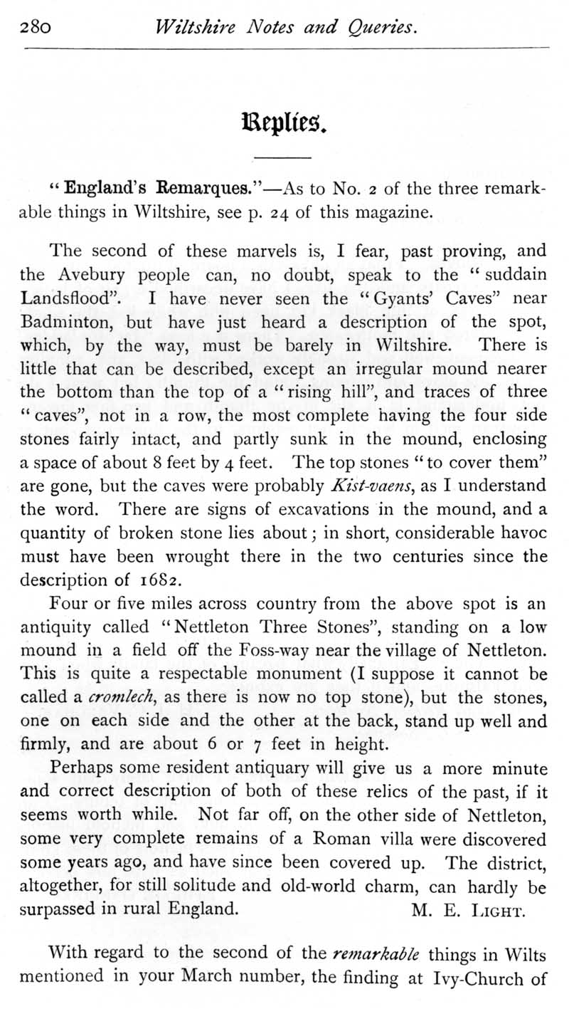 Page 42 The 'caves' near Luckington and a prehistoric monument at Nettleton. Supposed discovery of a giant's corpse at Alderbury.