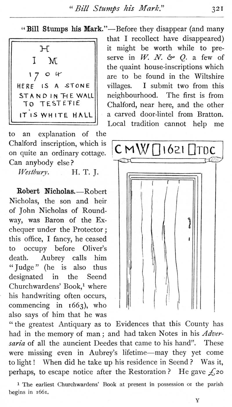 Page 32 Initials inscribed on houses at Bratton and Chalford.\"Judge\" Robert Nicholas of Seend.