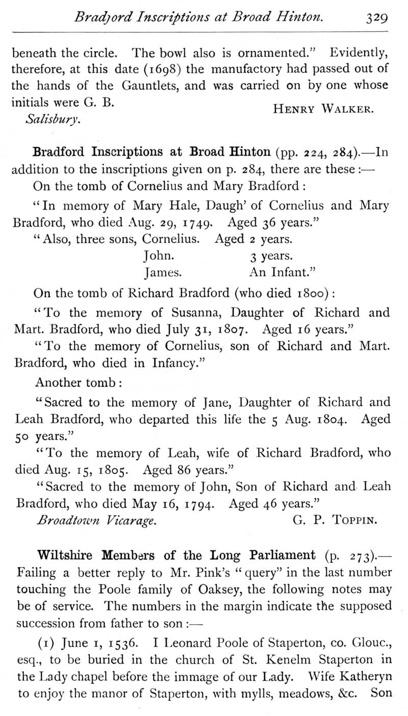 Page 40 Tobacco pipes made at Amesbury. Inscriptions to Bradford family at Broad Hinton. Wiltshire members of the Long Parliament: Poole family.