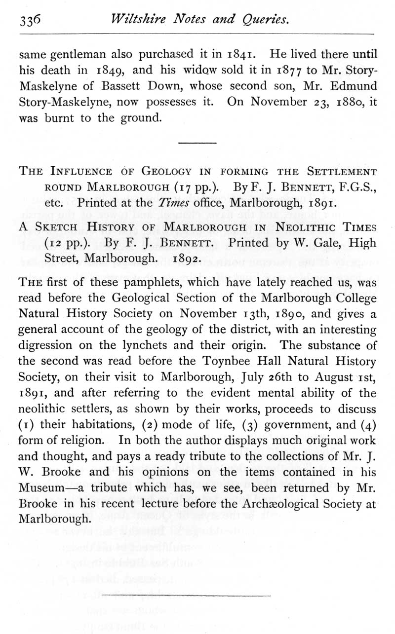 Page 47 Review of a book on Lydiard manor. Notice of two pamphlets on the influence of geology on settlement around Marlborough, and Marlborough in Neolithic times.