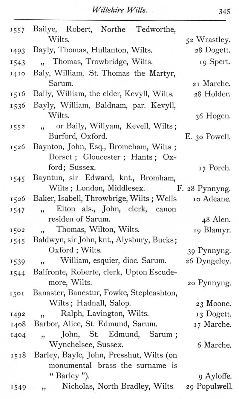 Page 8 Wiltshire wills proved in the Prerogative Court of Canterbury, 1383-1558, Bailye to Barley.