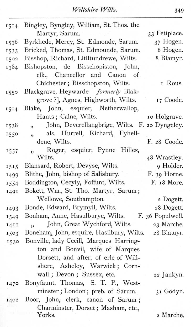 Page 12 Wiltshire wills proved in the Prerogative Court of Canterbury, 1383-1558, Bingley to Boor.