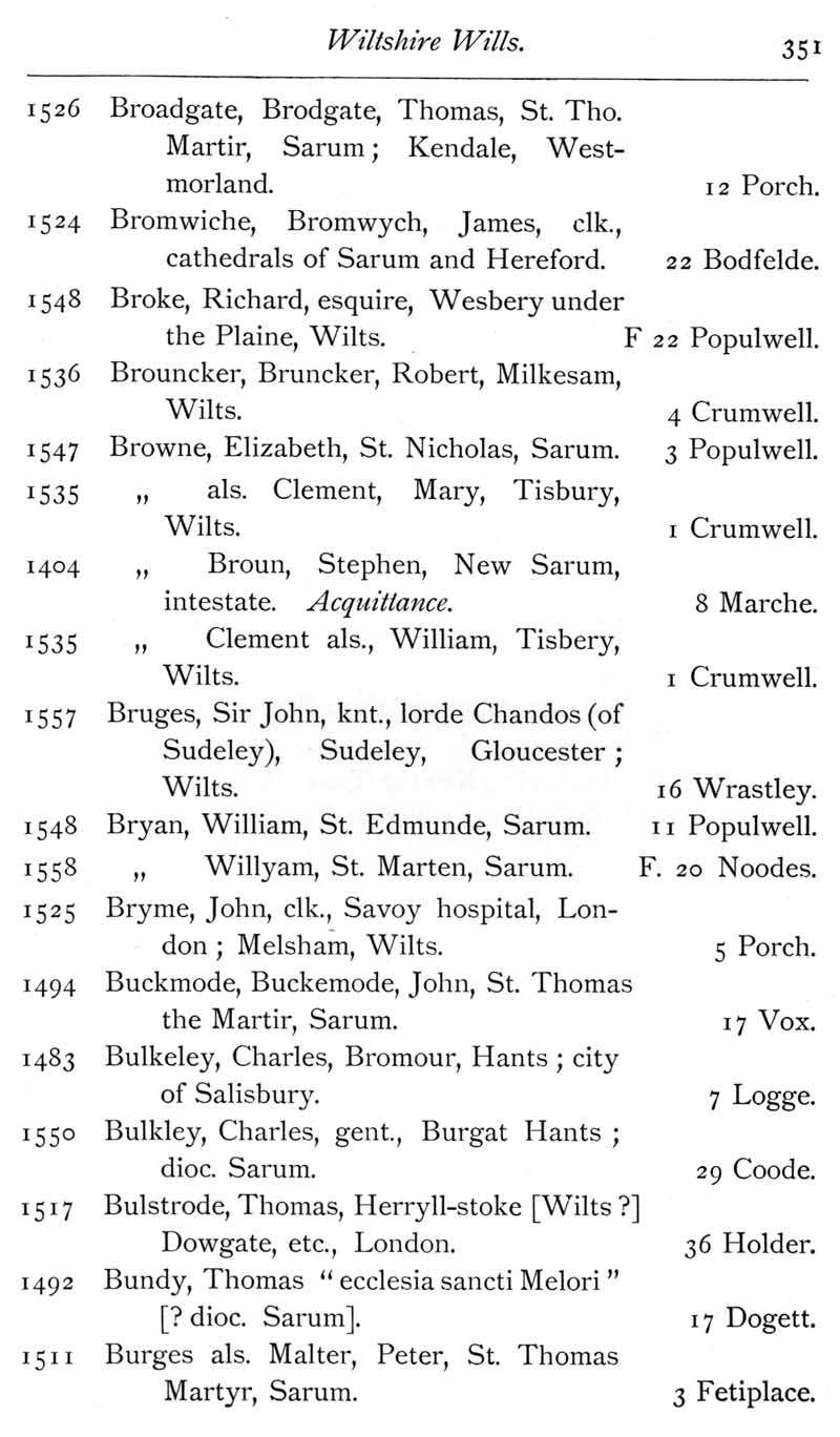 Page 14 Wiltshire wills proved in the Prerogative Court of Canterbury, 1383-1558, Broadgate to Burges.