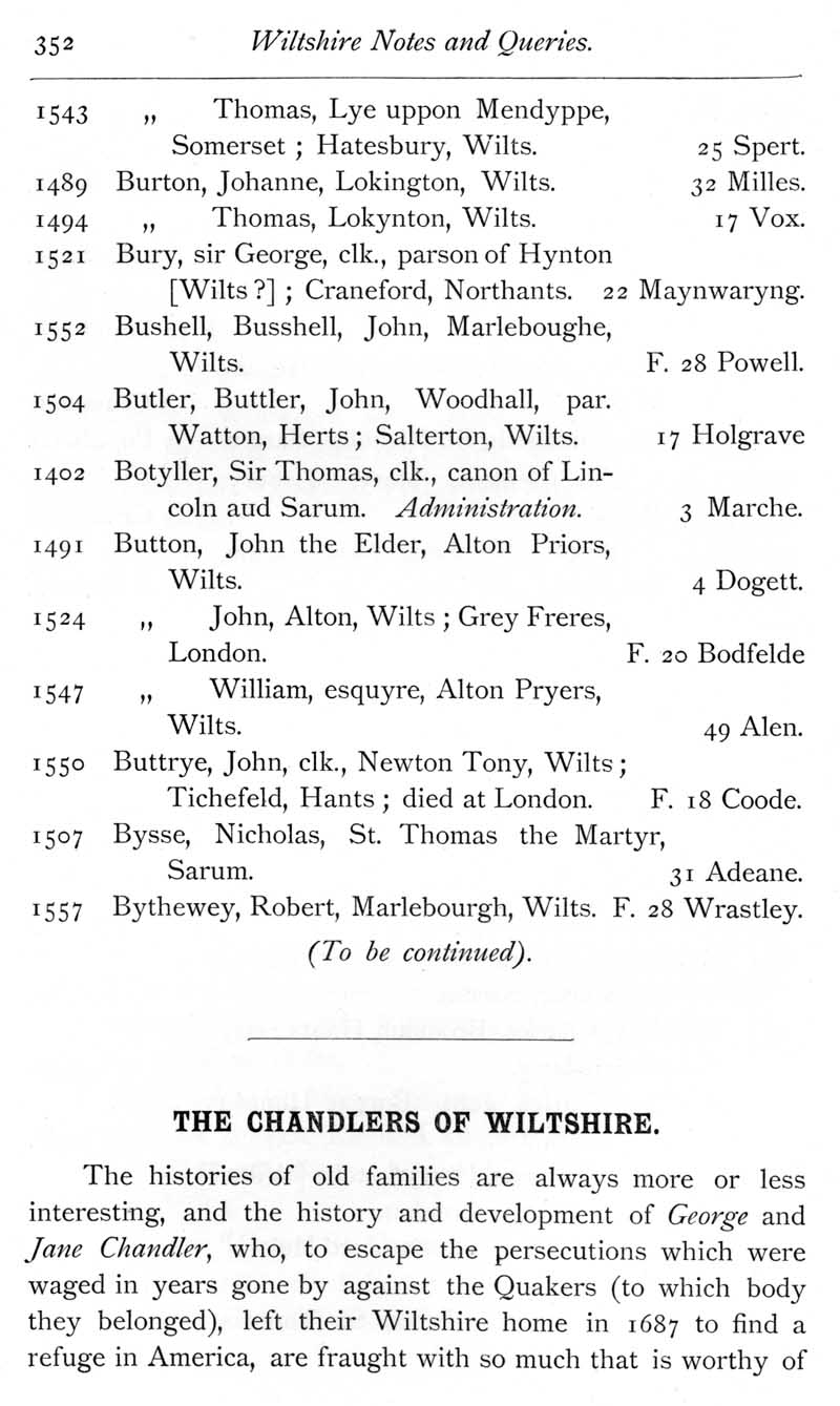 Page 15 Wiltshire wills proved in the Prerogative Court of Canterbury, 1383-1558, Burges to Bythewey. George and Jane Chandler, emigrants from Wiltshire to America in 1687.