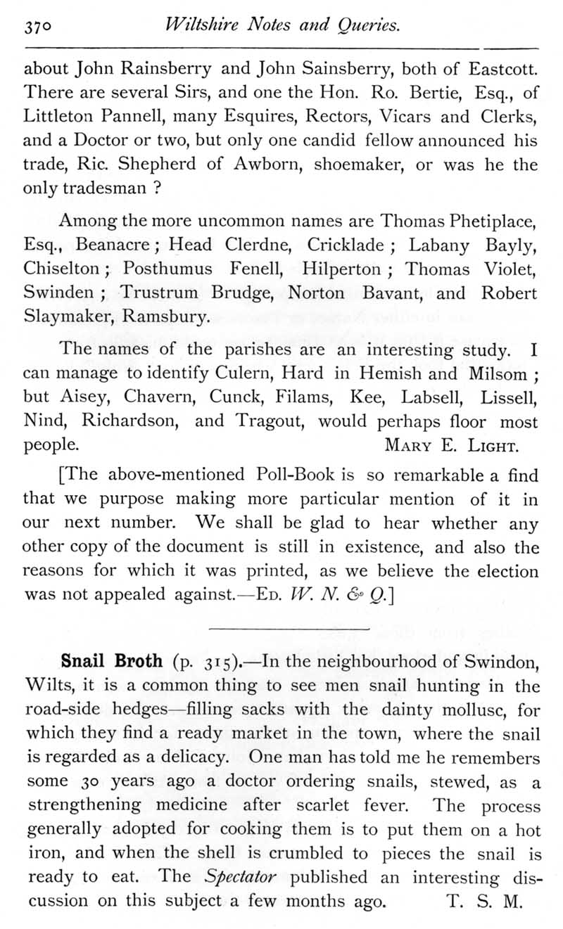Page 33 A Wiltshire poll-book of 1705. Snail broth, and snail collection near Swindon.